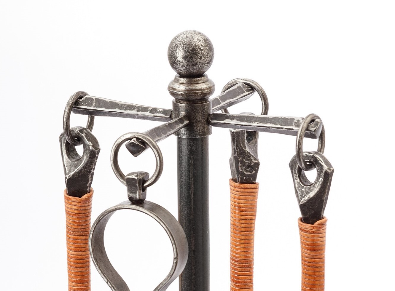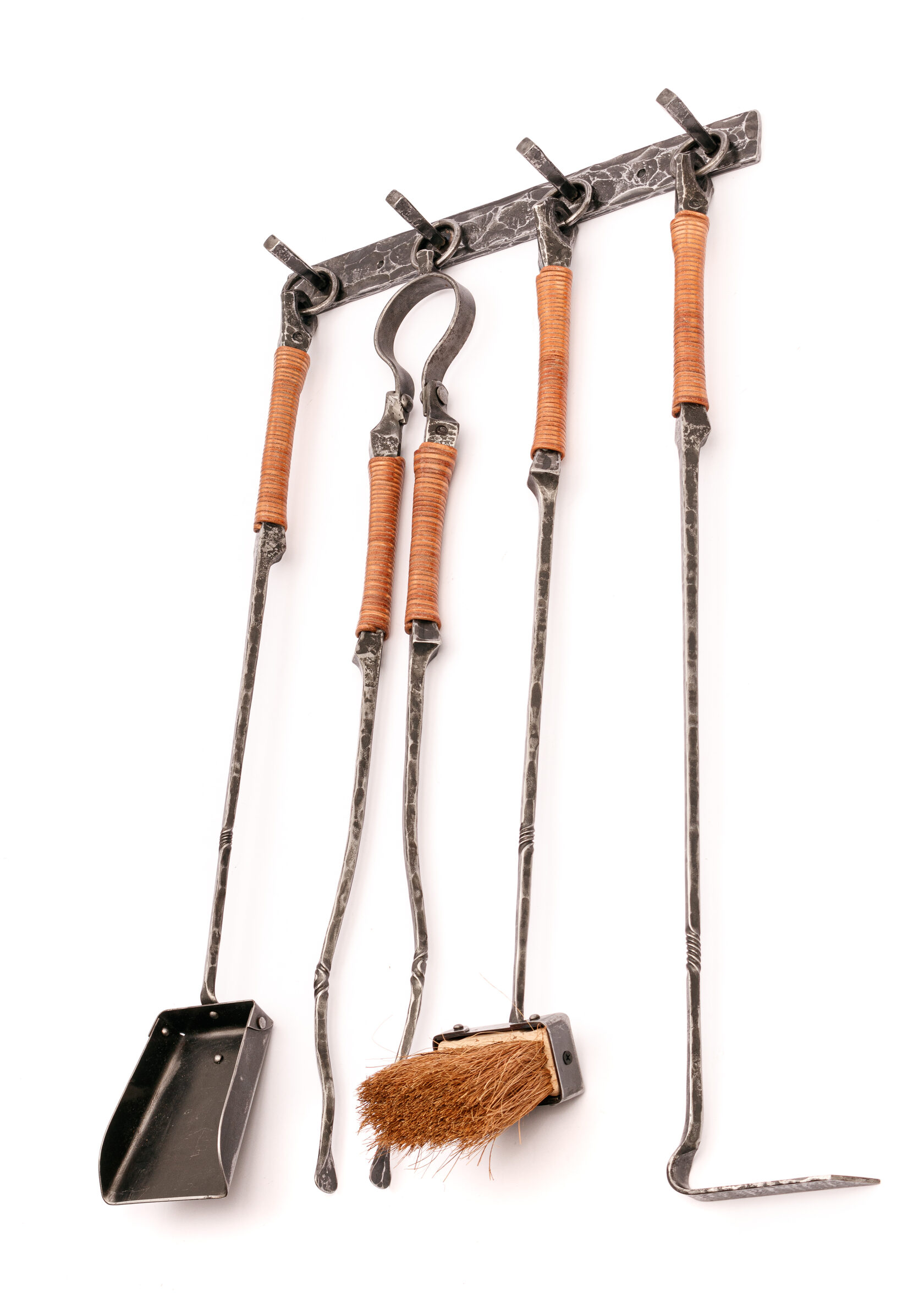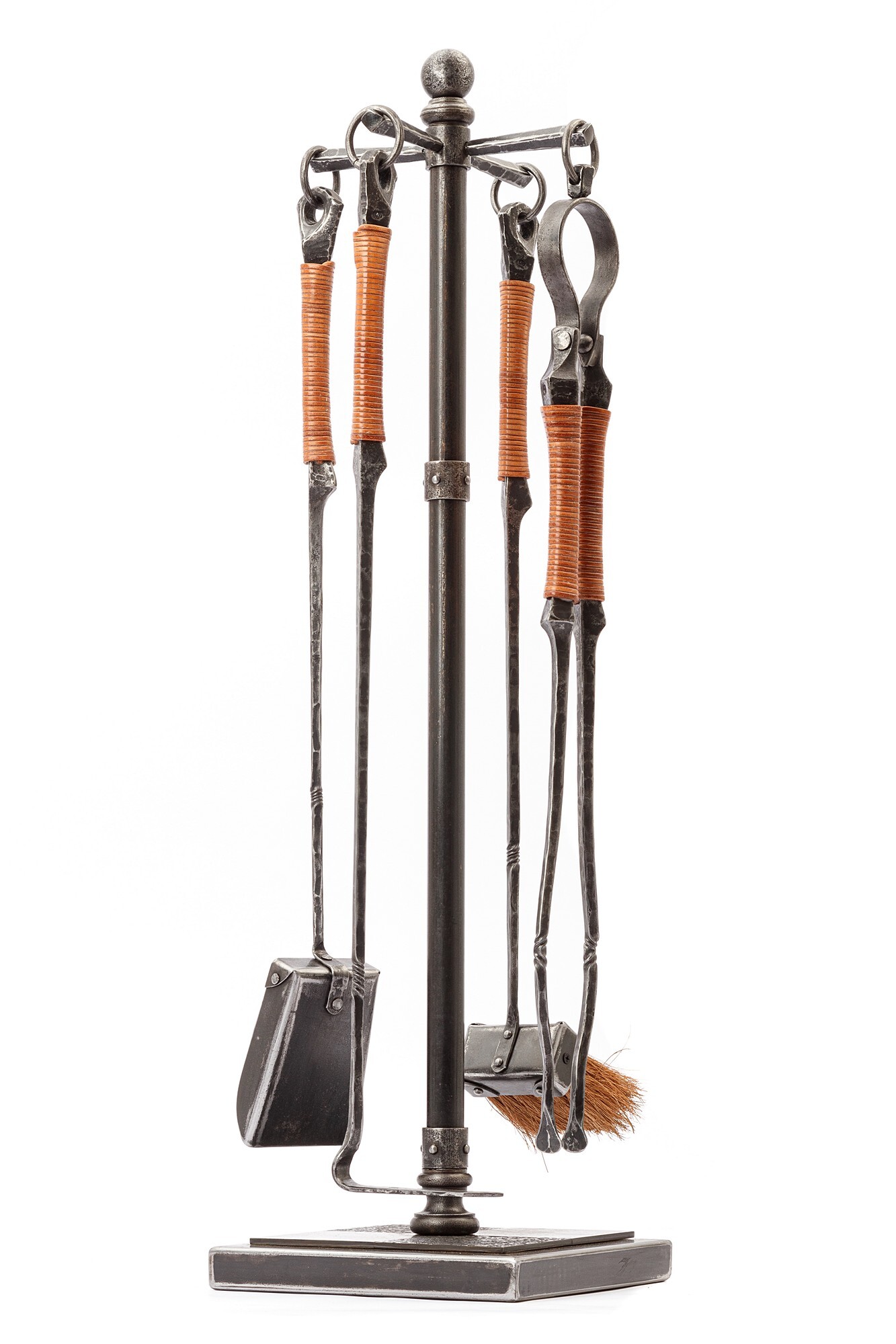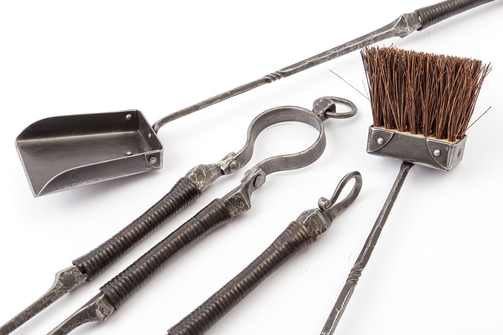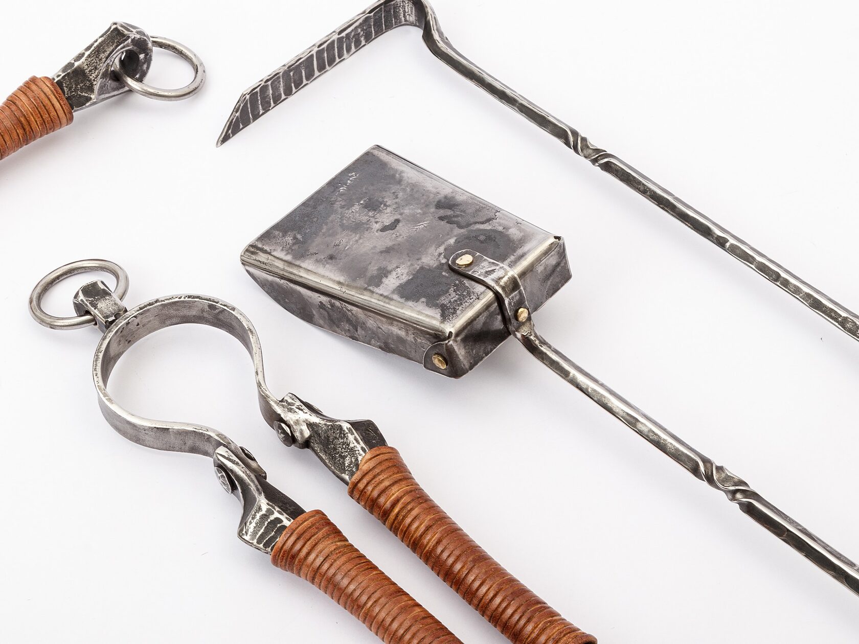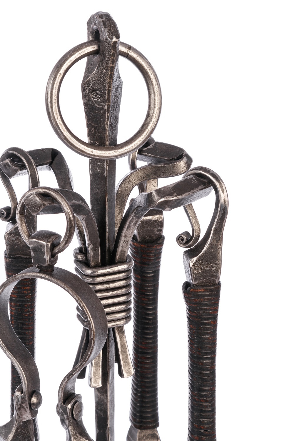 Ручки кочерги, щеток и других аксессуаров отделаны натуральной кожей. Материал отполирован, обработан специальными растворами от истирания и потемнения. Металлические части выкованы вручную из качественного металла, устойчивого к высоким температурам, коррозии. Кованый набор для печи, камина станет оригинальным подарком, украшением загородного дома.