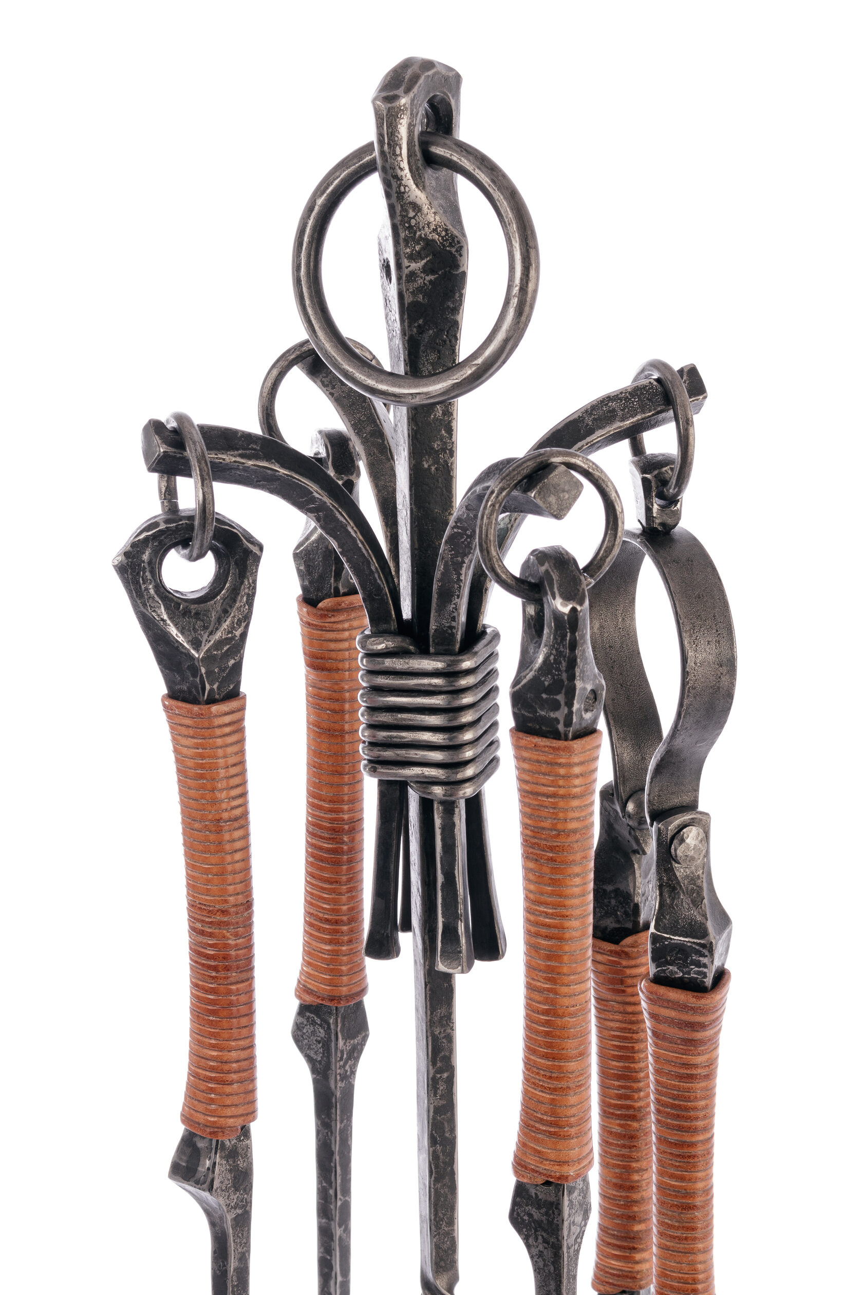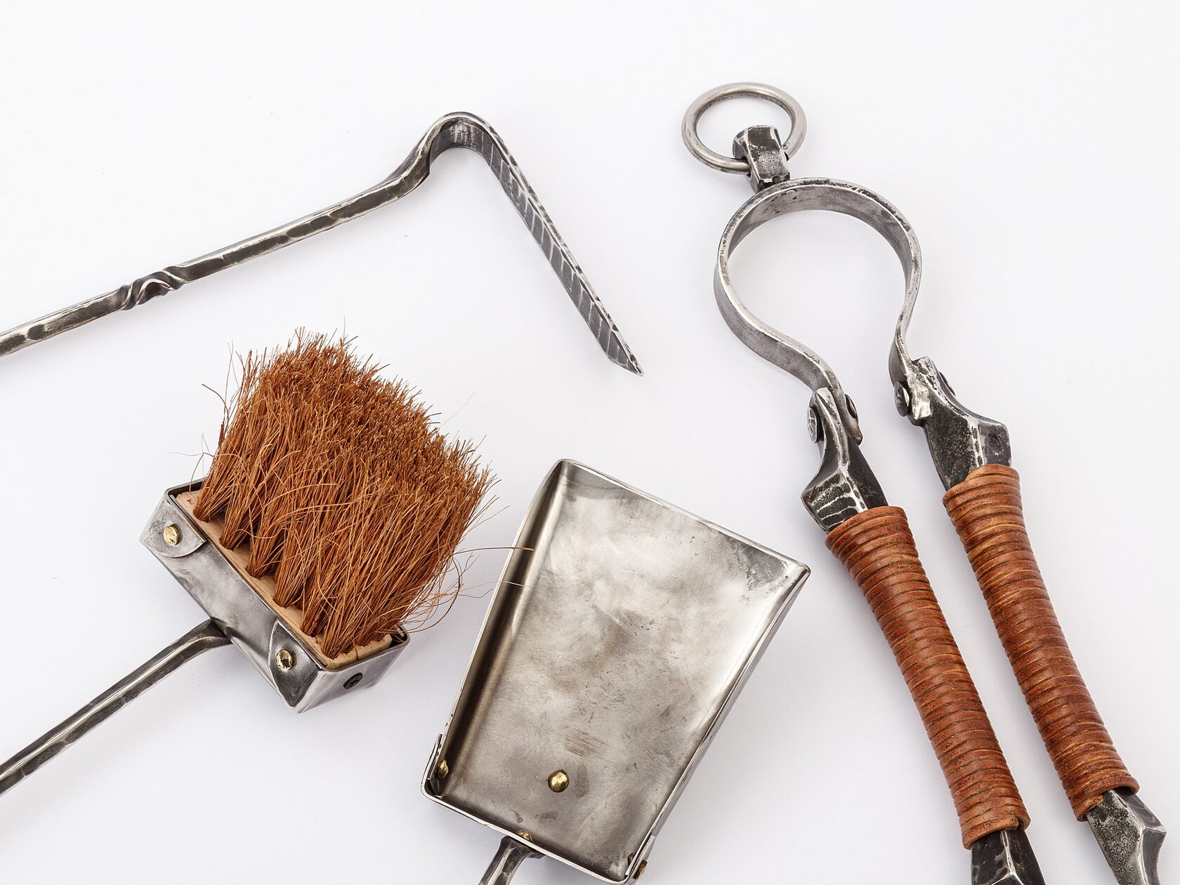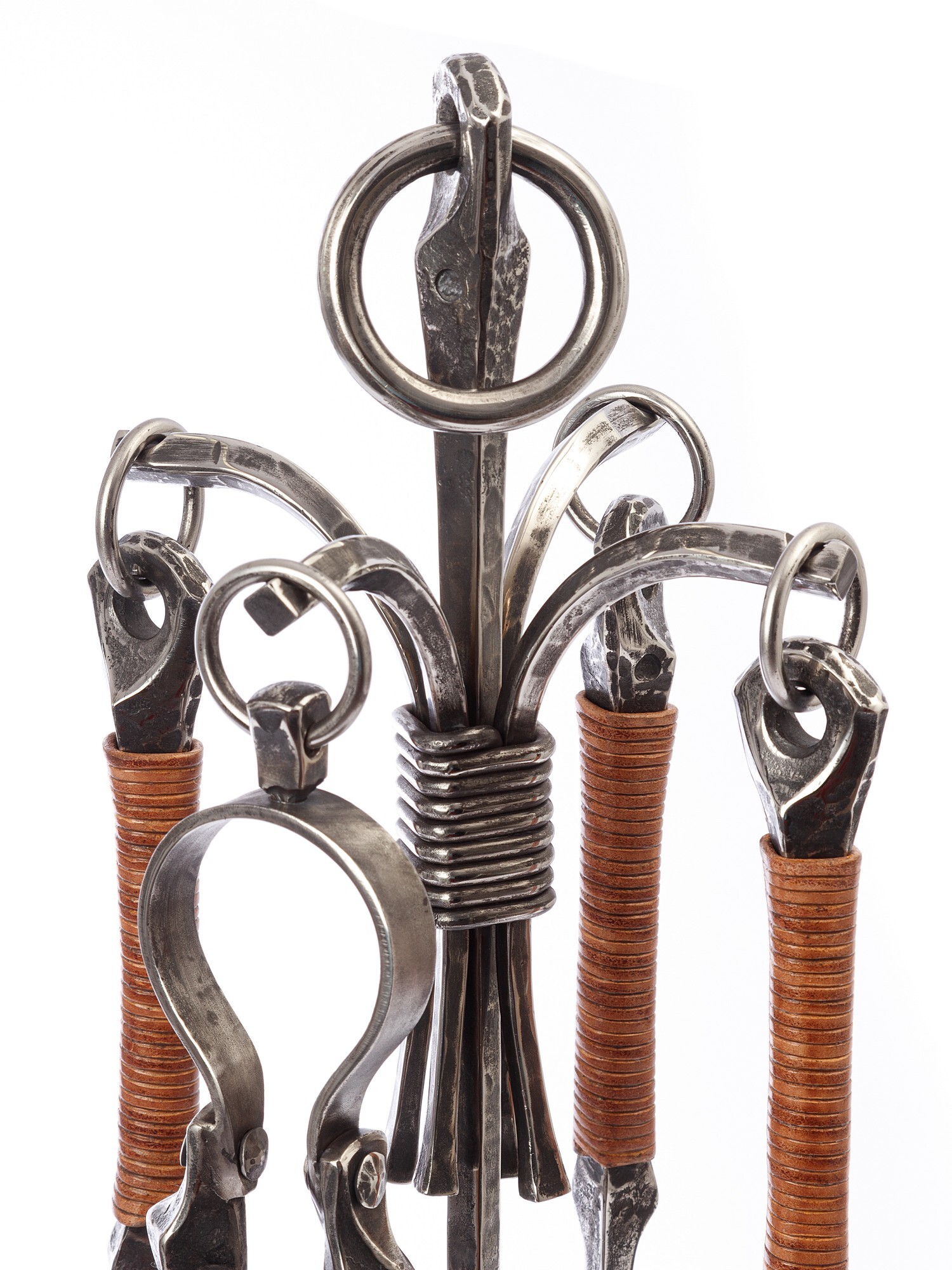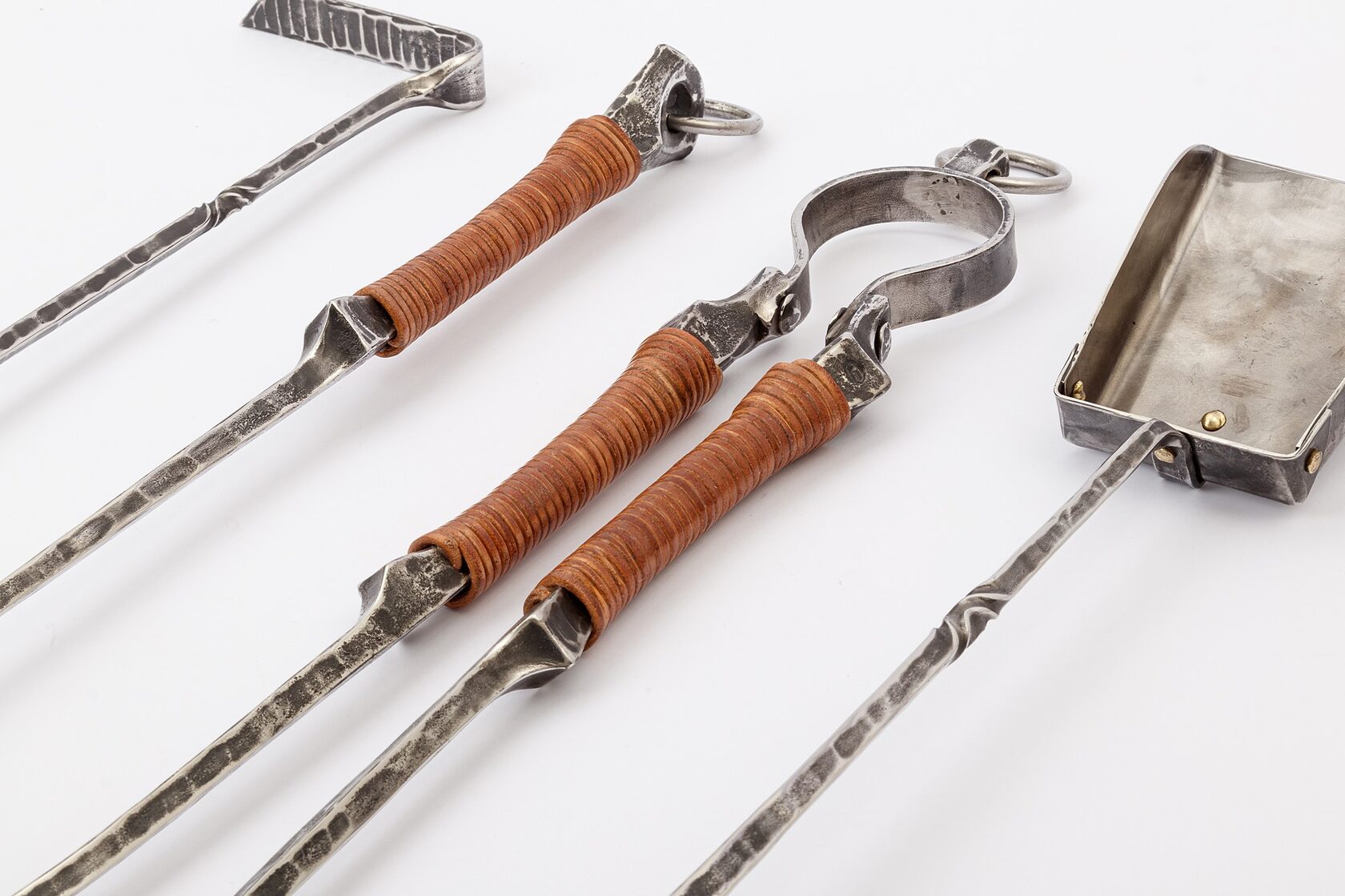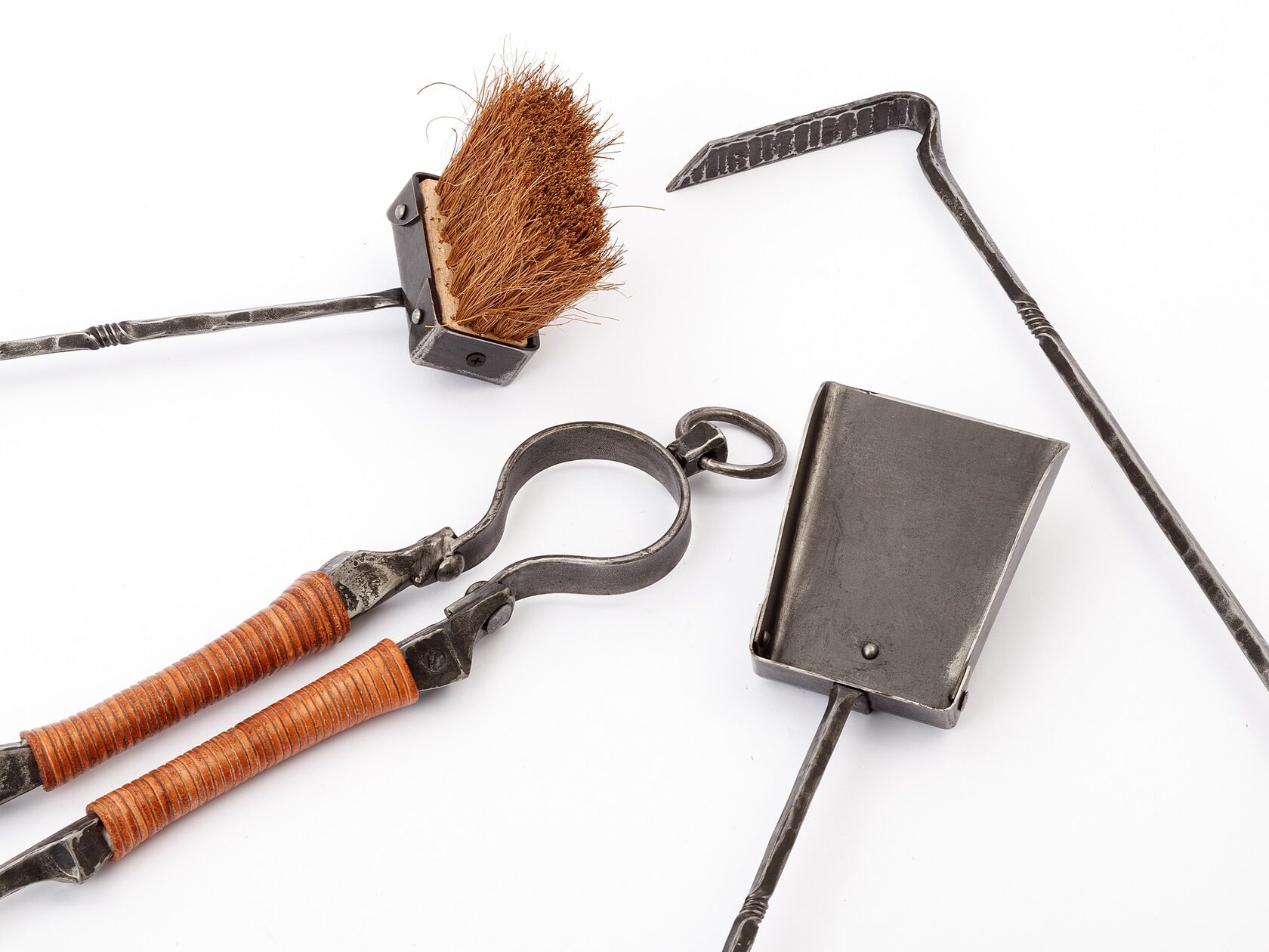 Ручки кочерги, щеток и других аксессуаров отделаны натуральной кожей. Материал отполирован, обработан специальными растворами от истирания и потемнения. Металлические части выкованы вручную из качественного металла, устойчивого к высоким температурам, коррозии. Кованый набор для печи, камина станет оригинальным подарком, украшением загородного дома.