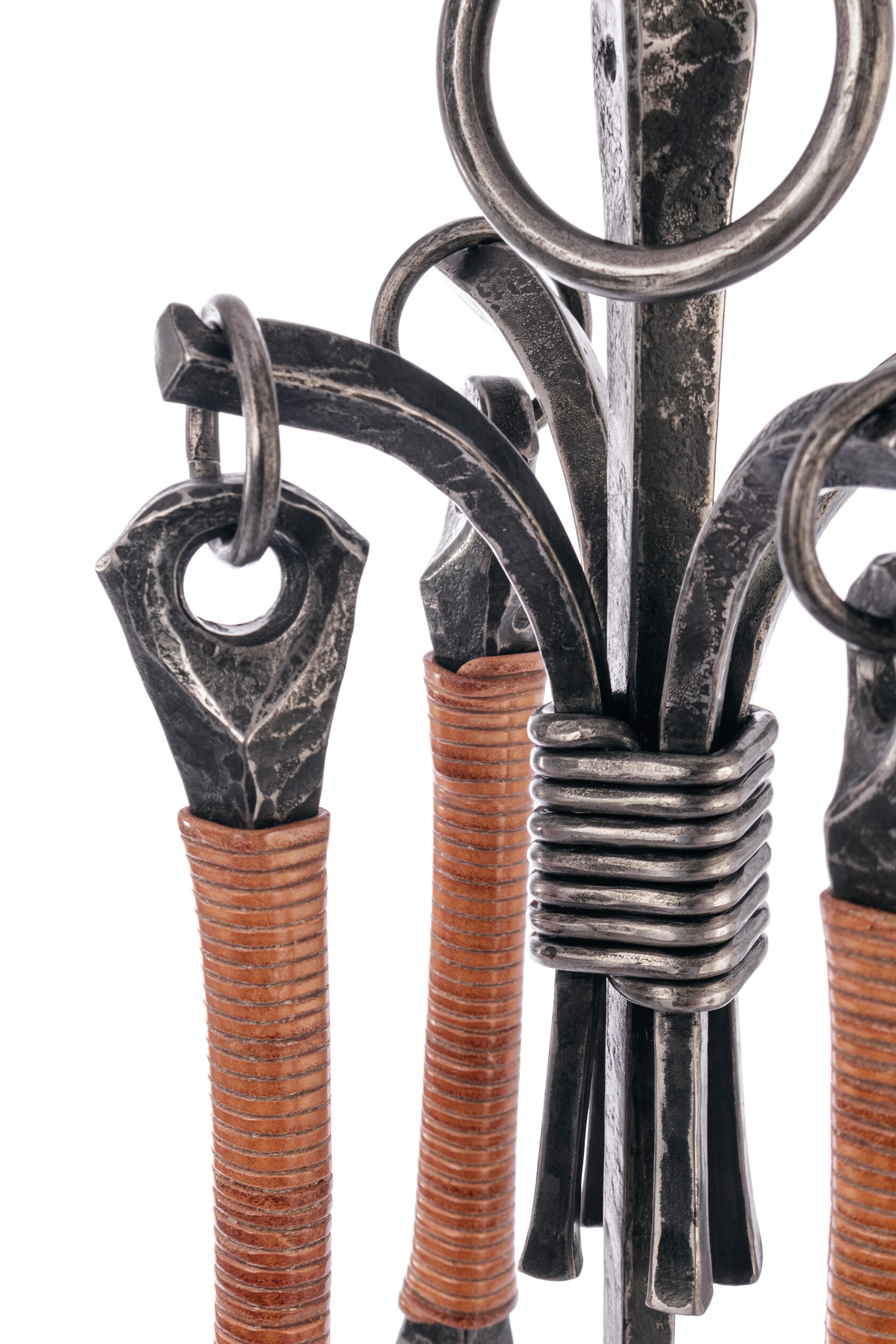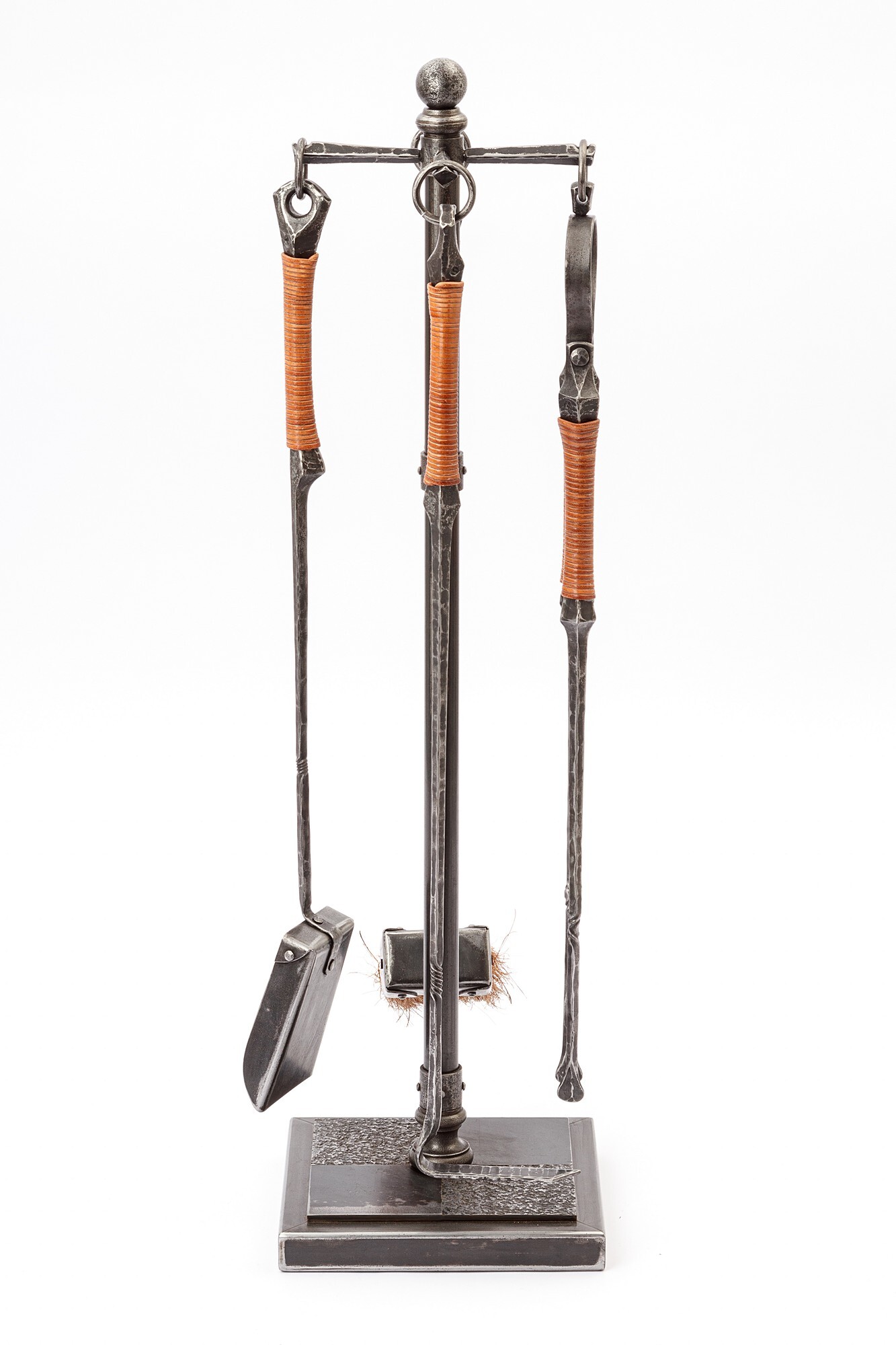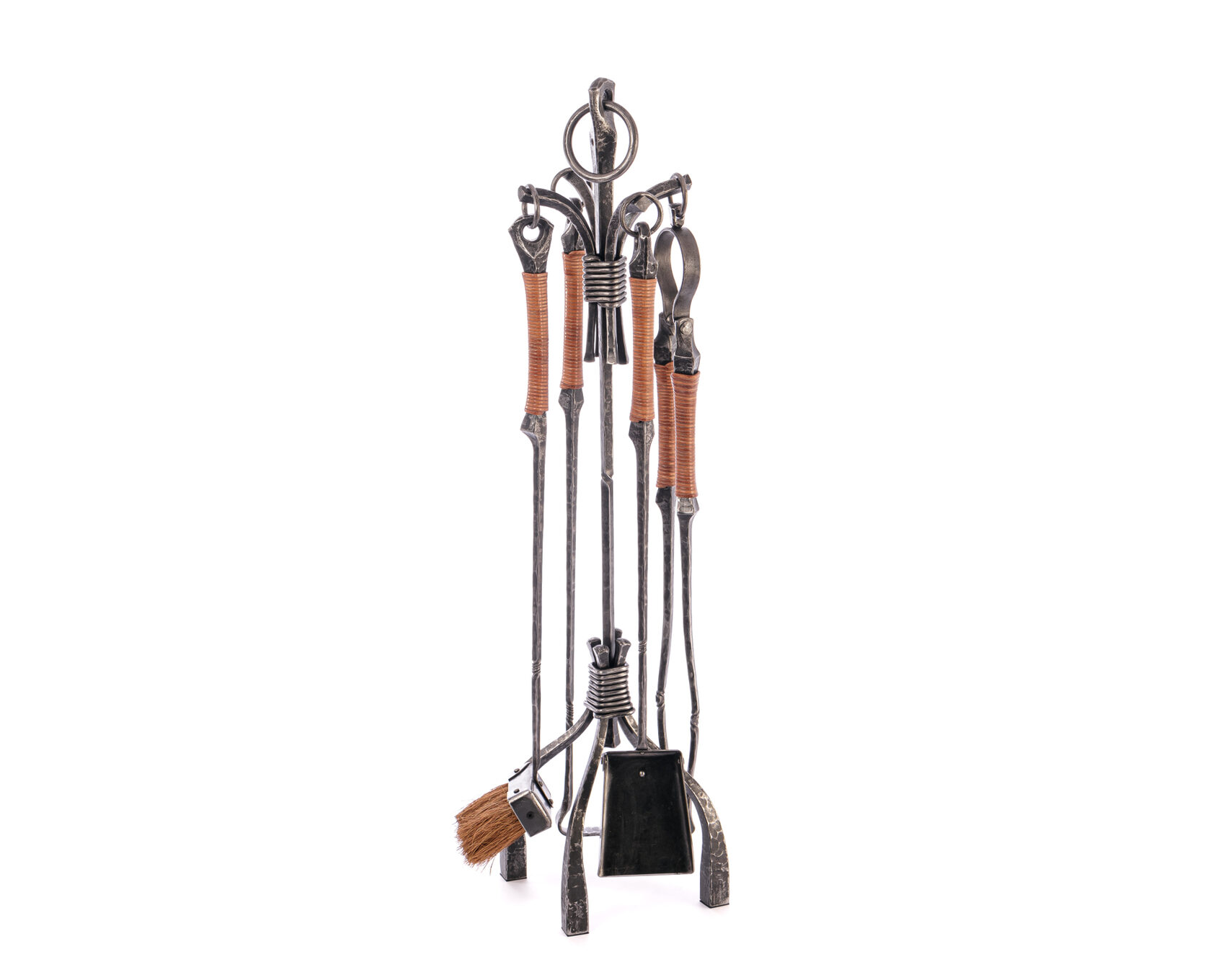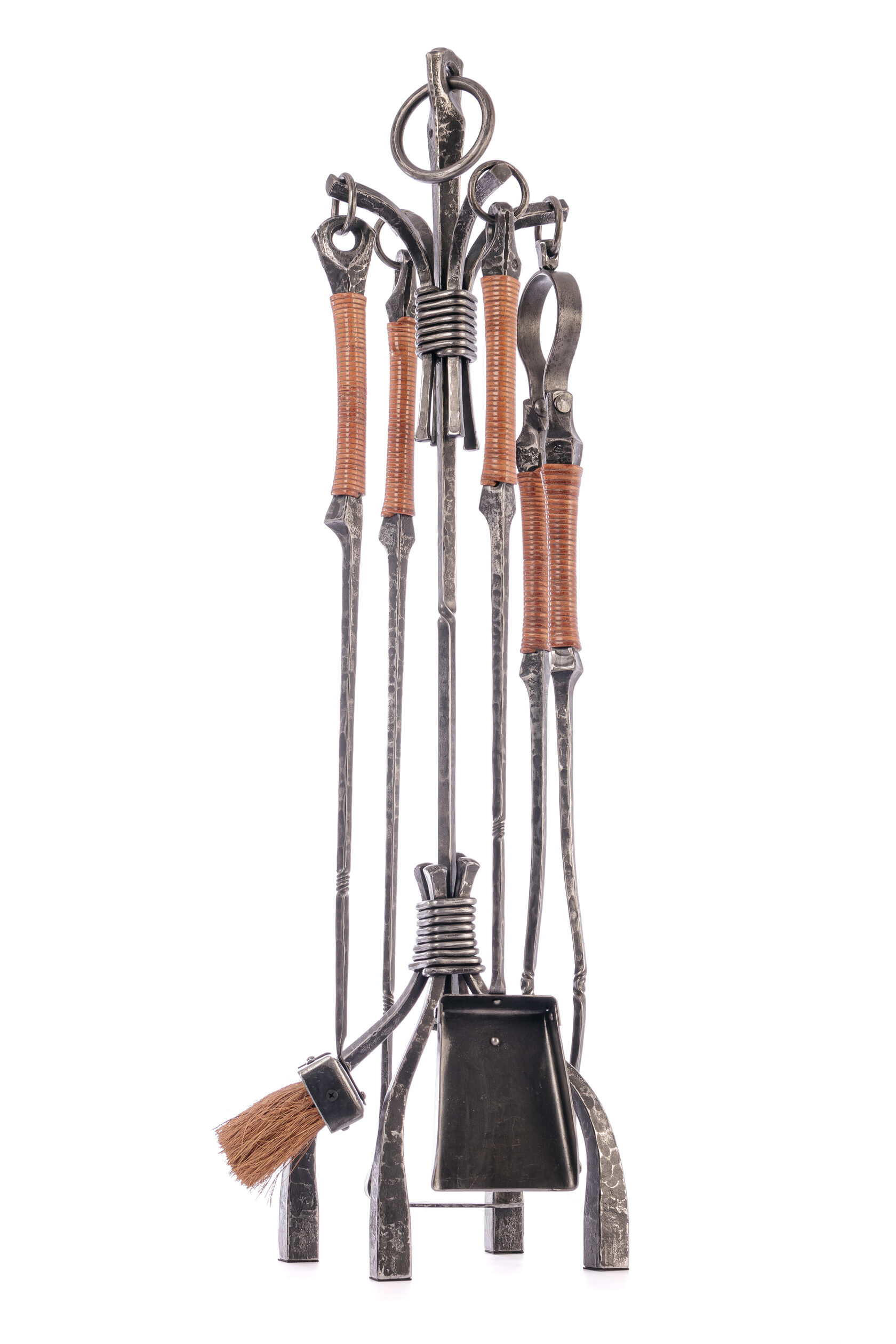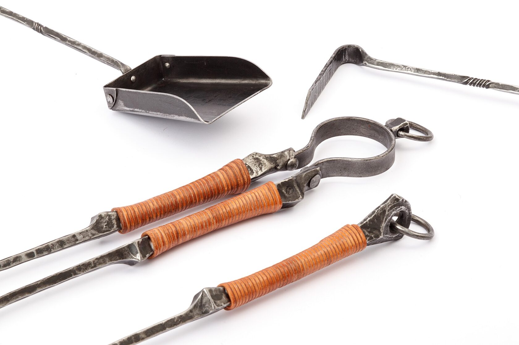 Ручки кочерги, щеток и других аксессуаров отделаны натуральной кожей. Материал отполирован, обработан специальными растворами от истирания и потемнения. Металлические части выкованы вручную из качественного металла, устойчивого к высоким температурам, коррозии. Кованый набор для печи, камина станет оригинальным подарком, украшением загородного дома.