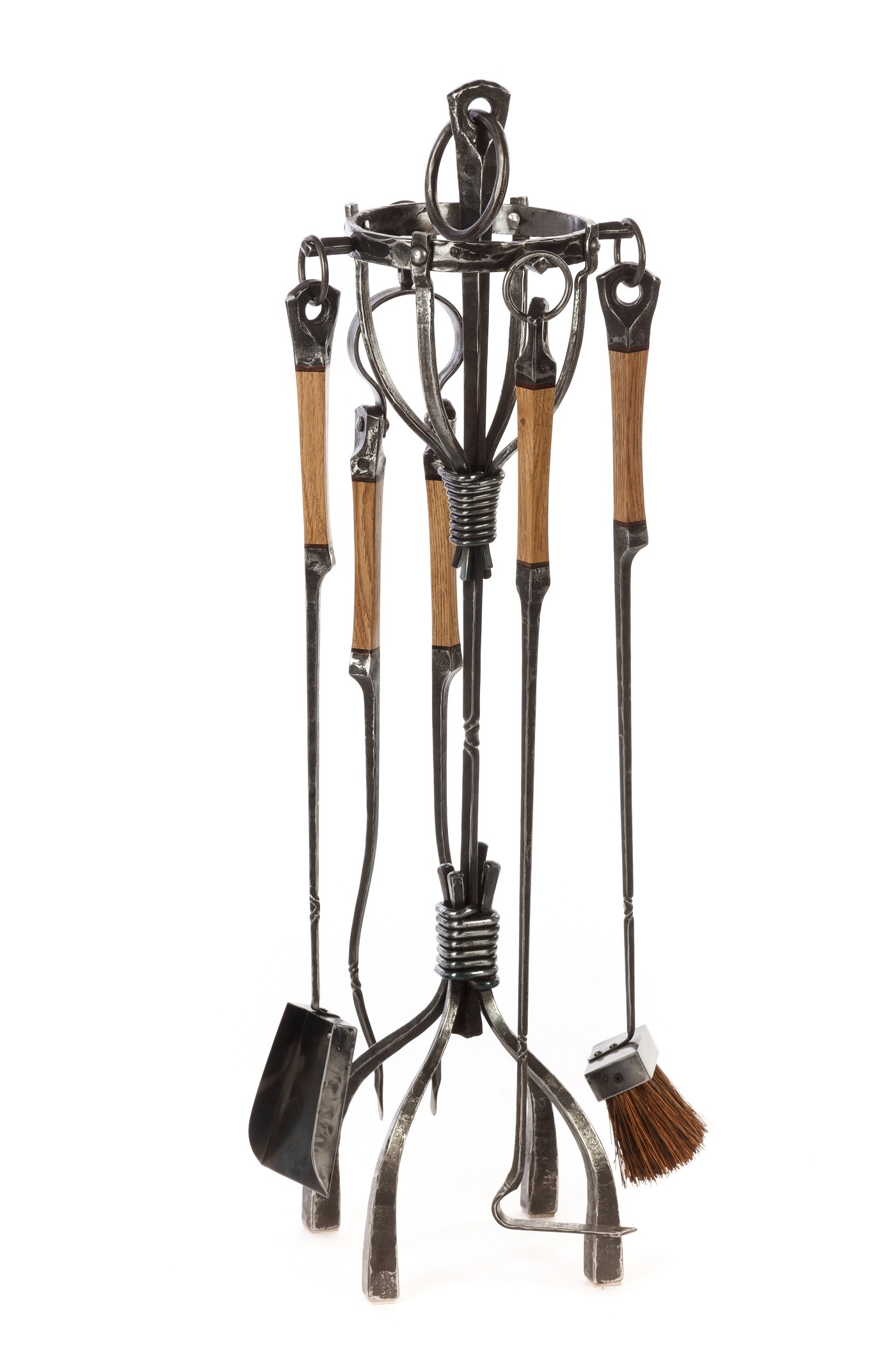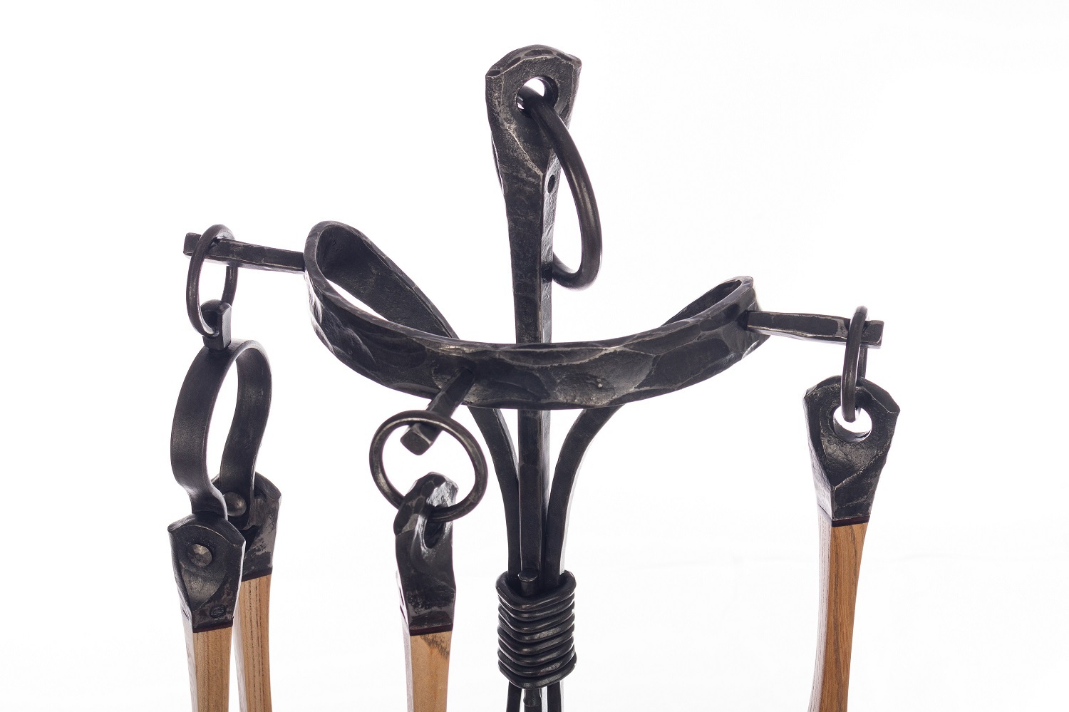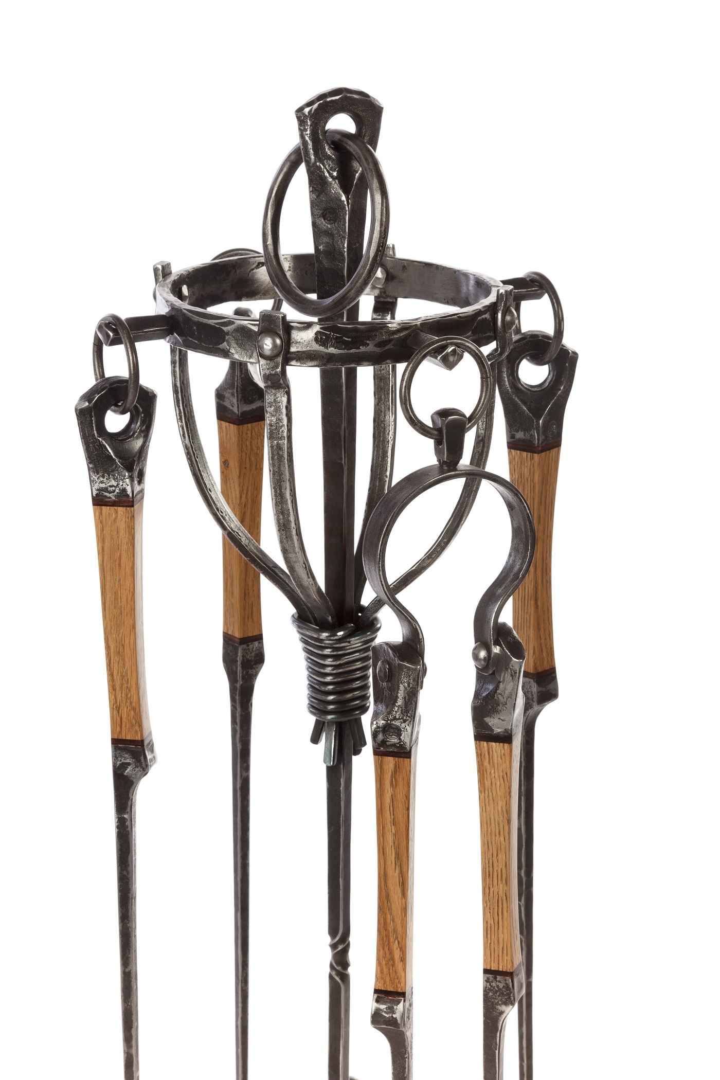 Авторский дизайн набора с подчеркиванием традиционных приемов ручной ковки без излишних декораций в виде завитушек, листочков и т.д. допускает использование как в современном минималистичном дизайне, так и для традиционного каменного камина. Материал ручек-дуб. Ценная и твердая порода дерева. Приятно наощупь, отшлифовано, отполировано и покрыто лаком. Прочный монтаж с металлом через шпильку 8мм и эпоксидный клей.