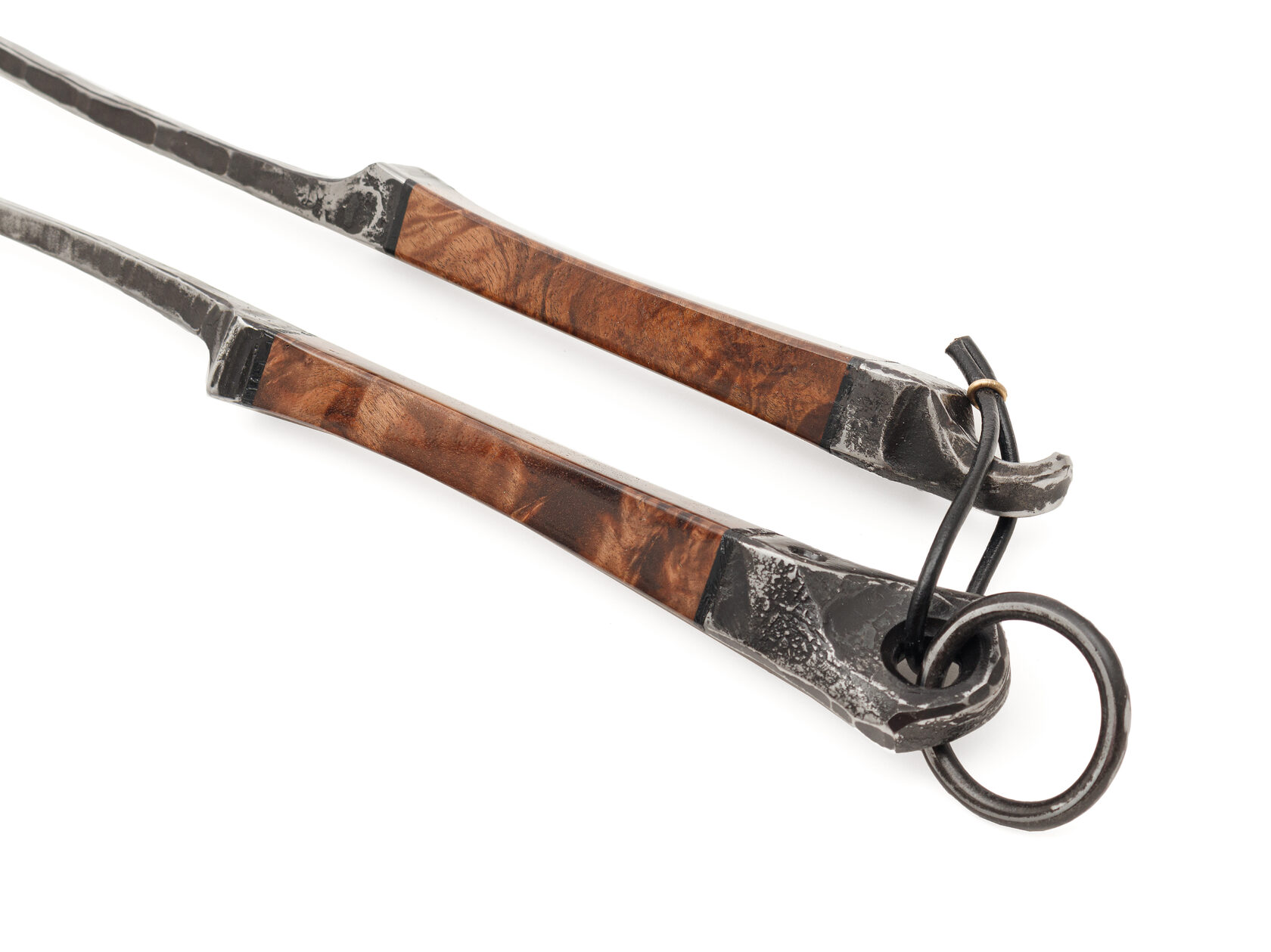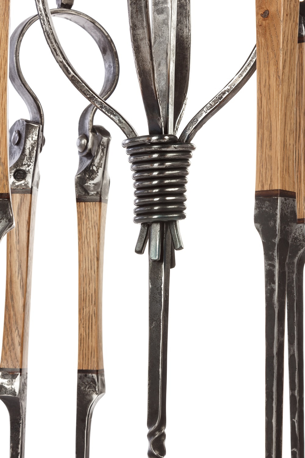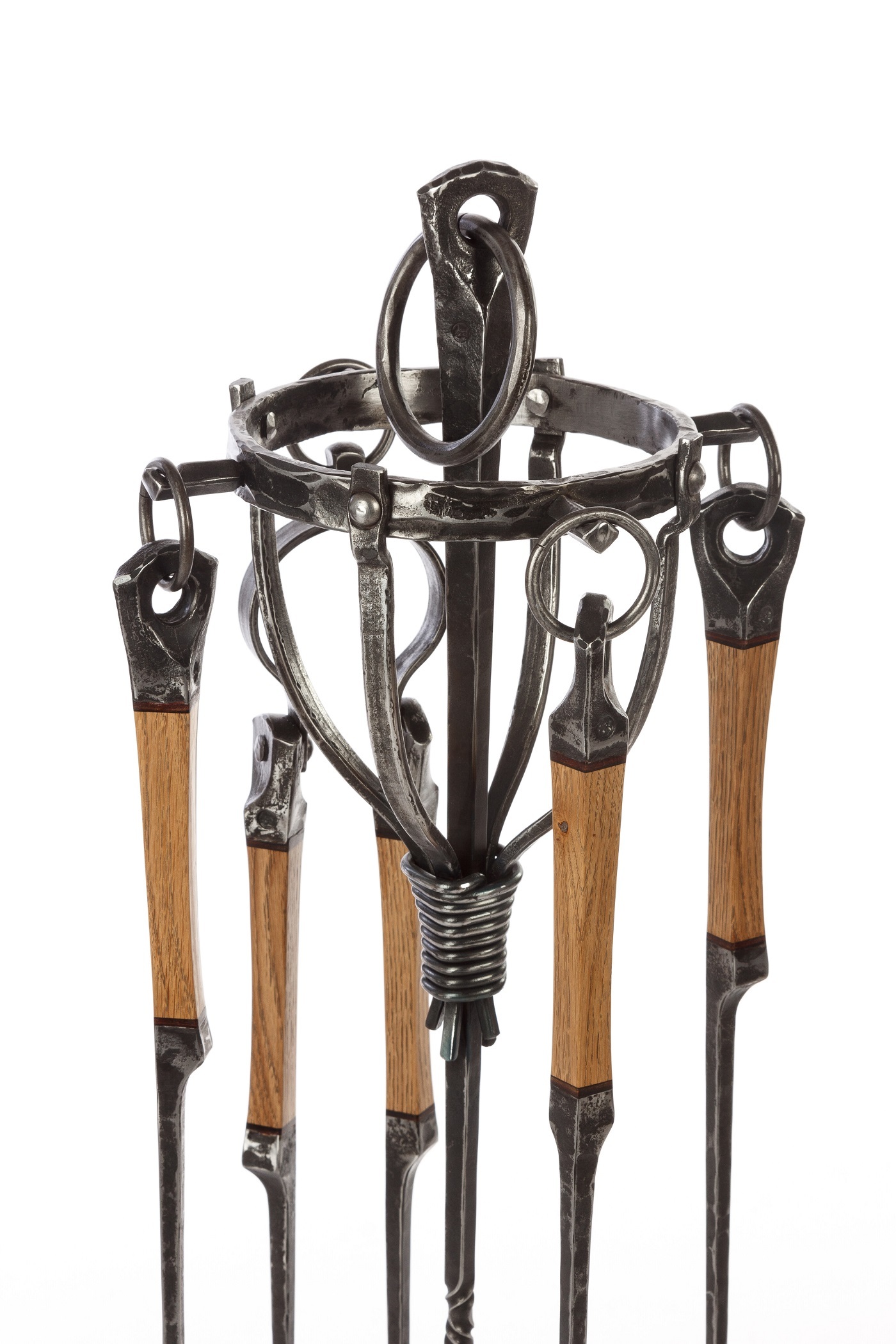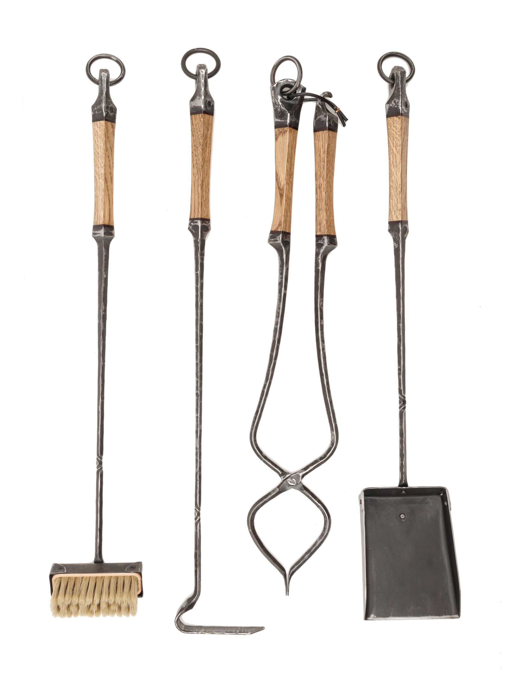 Авторский дизайн набора с подчеркиванием традиционных приемов ручной ковки без излишних декораций в виде завитушек, листочков и т.д. допускает использование как в современном минималистичном дизайне, так и для традиционного каменного камина. Материал ручек-дуб. Ценная и твердая порода дерева. Приятно наощупь, отшлифовано, отполировано и покрыто лаком. Прочный монтаж с металлом через шпильку 8мм и эпоксидный клей.