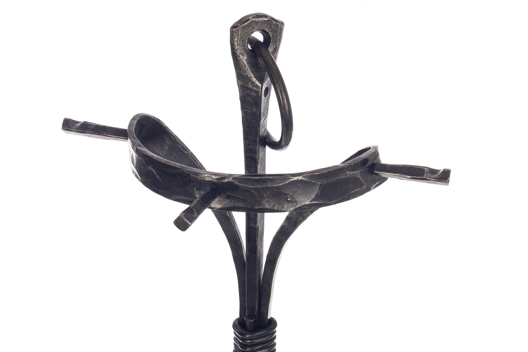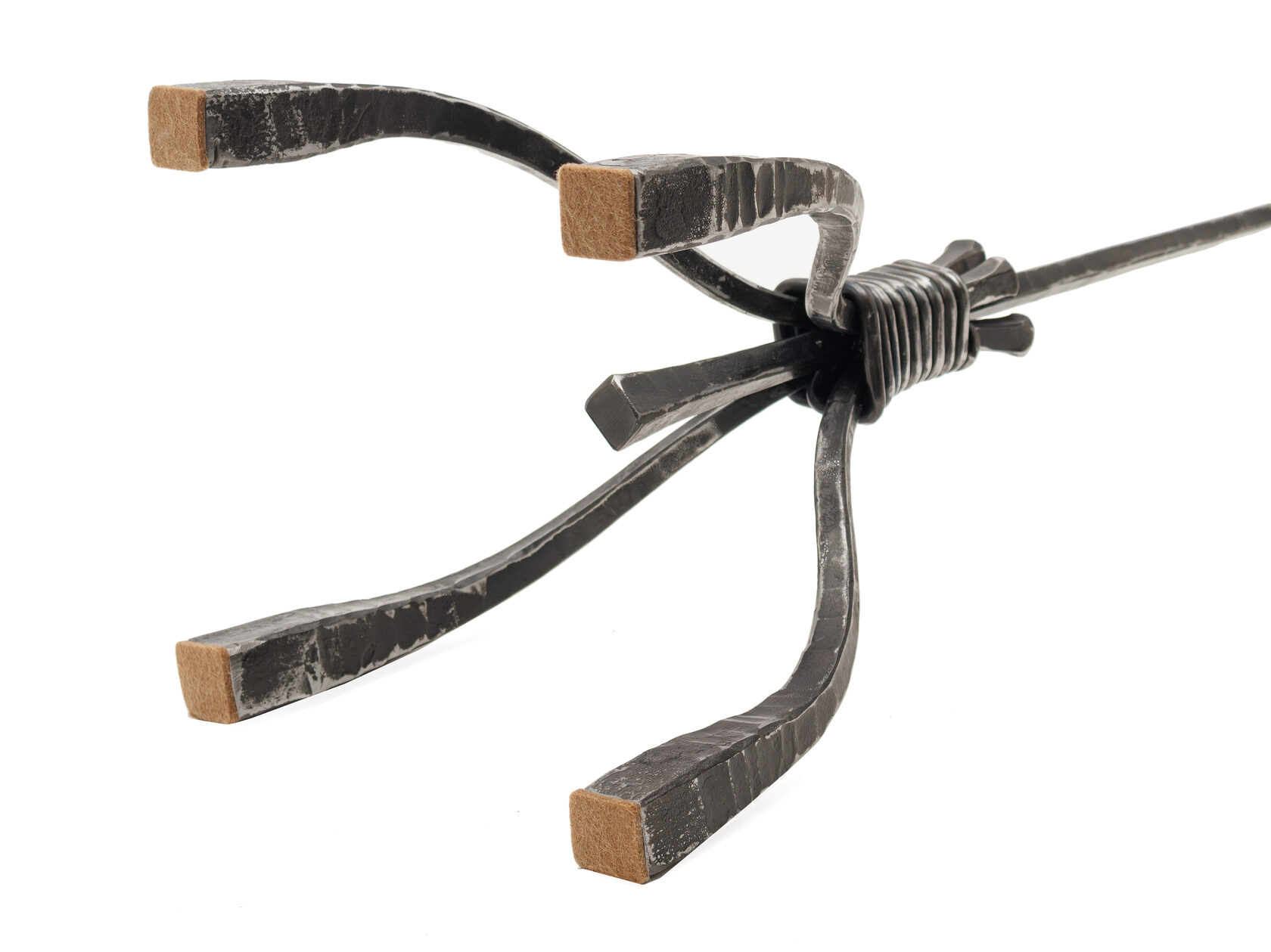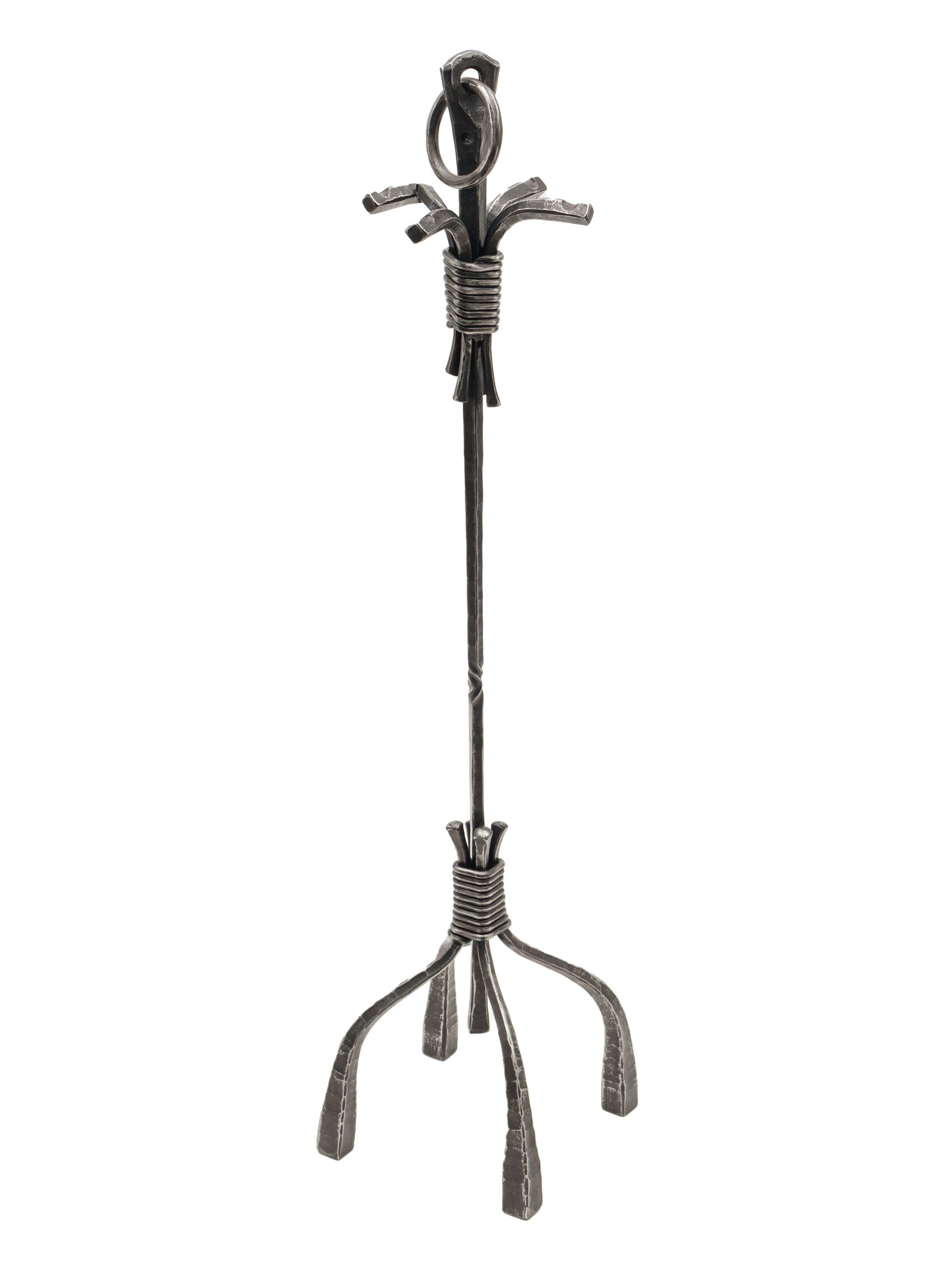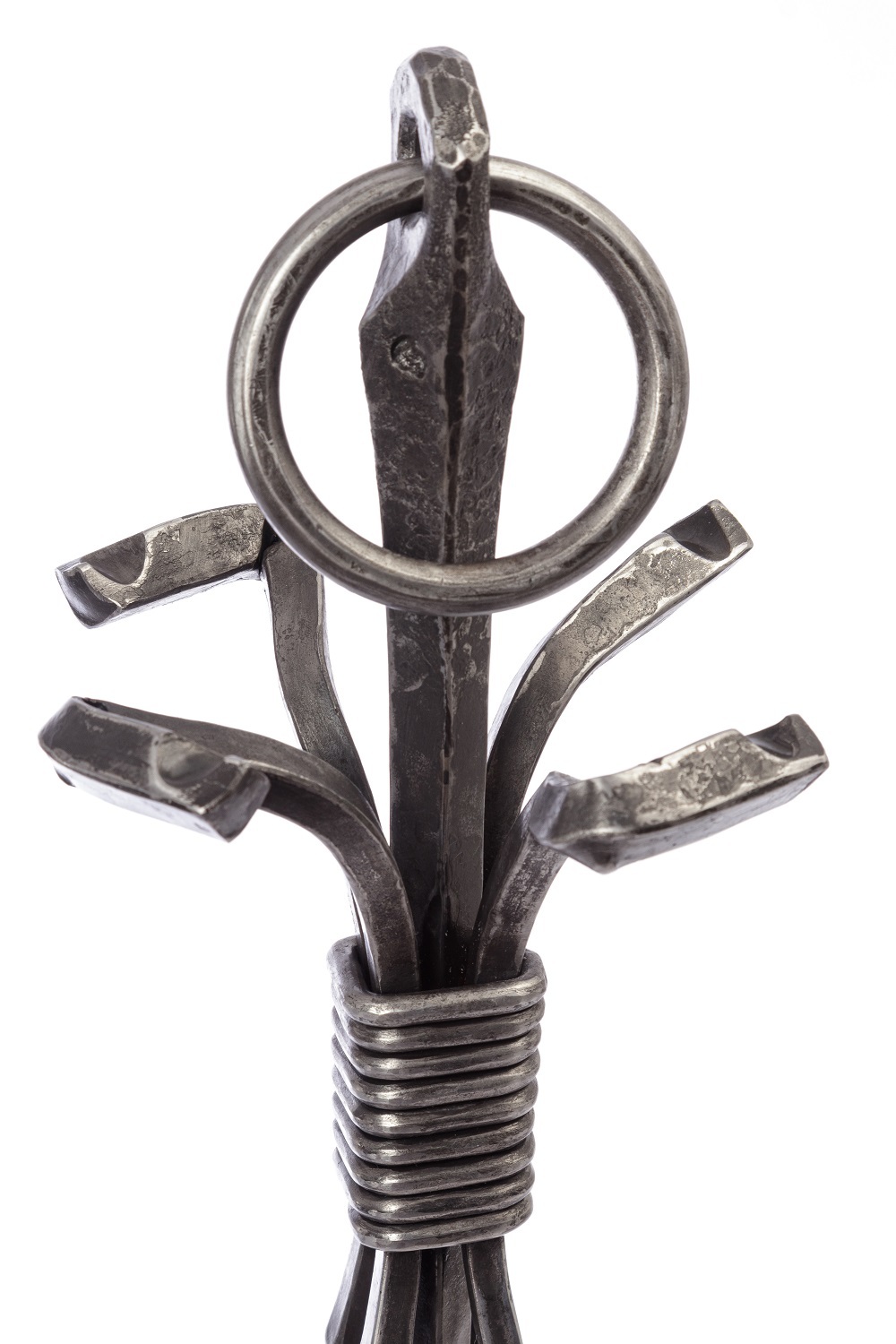 Каминный набор "Галант" «Галант» – оригинальный кованый каминный набор, сделанный вручную в кузнице. В композицию входит кочерга, совок и щипцы, размещенные на стойке с 4-мя изящными ножками. Компактная композиция не занимает много места, выглядит привлекательно, подчеркивает интерьер комнаты, достоинства камина или печи. Особенности каминных принадлежностей: