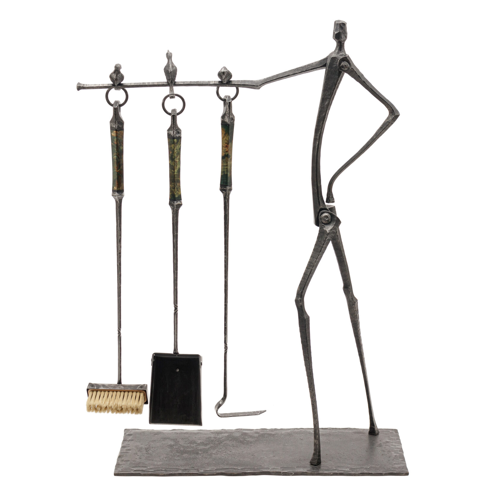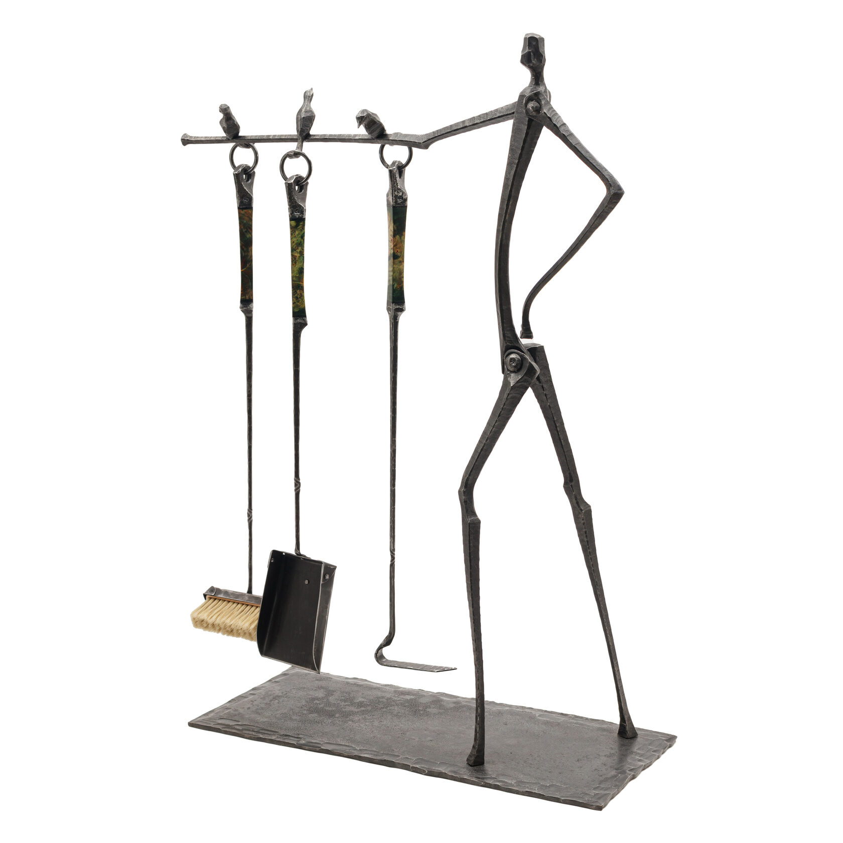 Оригинальный каминный набор из 4 предметов со стойкой: кочерга, совок, щипцы и щетка.