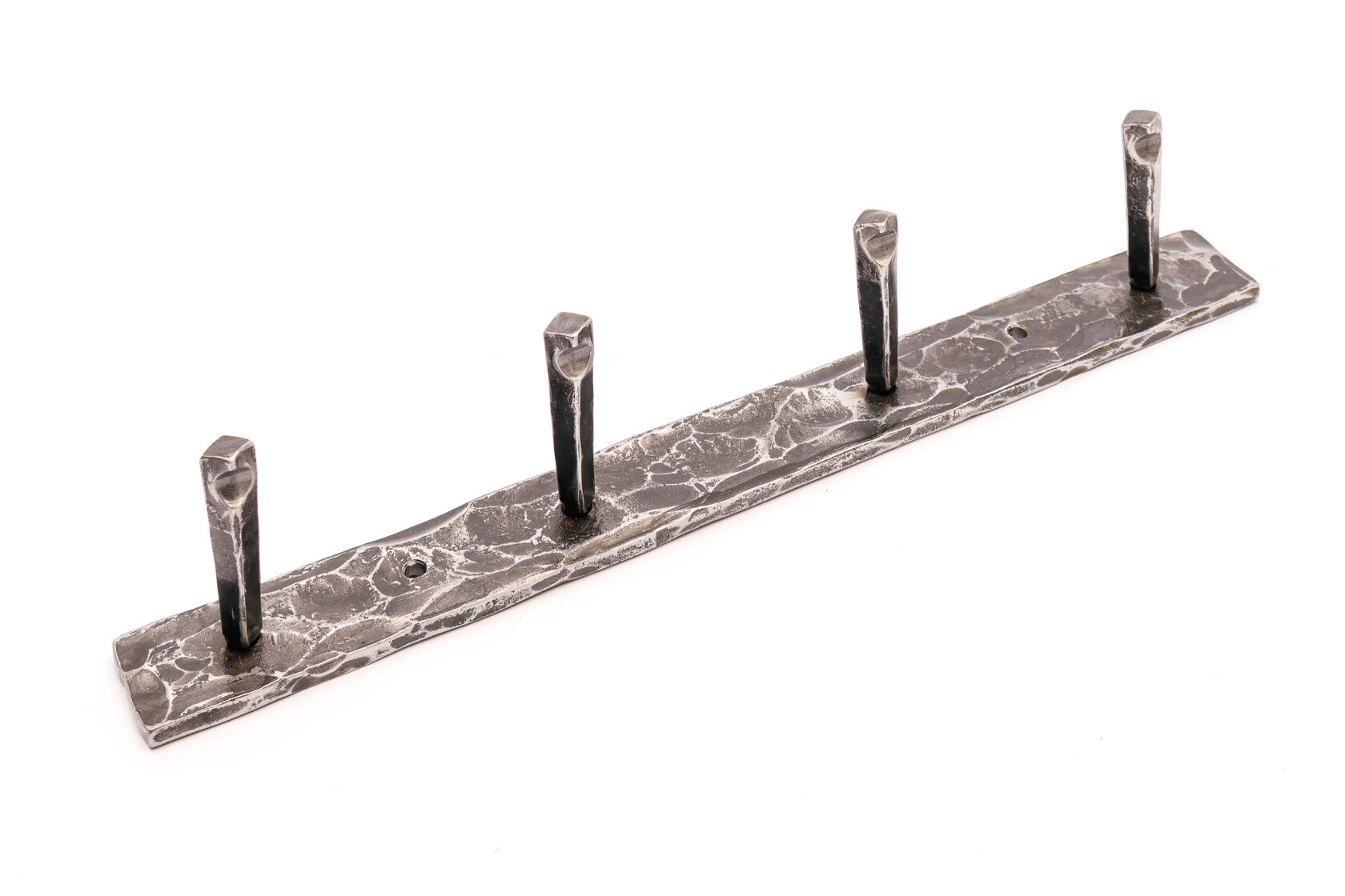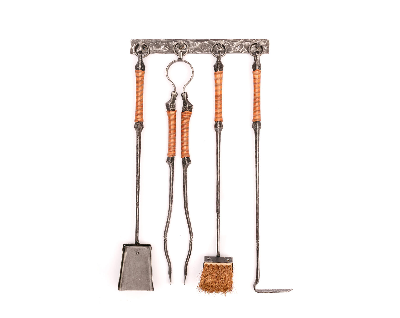 Кованый набор каминных принадлежностей из 4-х предметов на стену. Набор выполнен методом ковки. Характерная фактура кованого металла, понятные формы, аккуратность, удобство использования-основные цели при изготовлении этого набора. Помимо добротного внешнего вида набор также удобен в использовании. Инструменты удобно лежат в руке, сбалансированы по весу. Взяв их в руки, будете удивлены насколько они легче, чем кажутся. Это пожалуй первое, что отмечают заказчики. Ручки выделаны кожаным шнуром. Шнур замотан через отверстия в металле и полностью проклеен. Кожа отполирована и обработана специальными средствами. В дальнейшем уходе не нуждается. Максимум протереть сухой тряпкой. Цвет кожи возможно обсудить во время заказа: светло-коричневая, темно-коричневая и практически черная. Цвет металла также возможен черный или с патиной под серебро, золото или медь. (На фото вариант: чернение и термостойкий бесцветный лак.) Размеры инструментов и вешалки к ним также обсуждаются индивидуально.